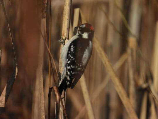 Downy woodpecker making a hole in an area with cattails.
