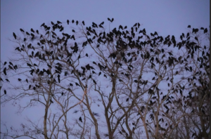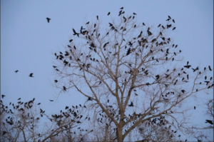 Crows assemble from dispersed foraging locations to sleep (roost) in large groups in winter, in part for protection from predators like Great Horned Owls. A large group has many sets of eyes and ears to detect predators, groups may harass predators and chase them away, and even if the conspicuous group attracts predators that eat a few crows, most will escape predation: crow predators have large territories and are not very social, so there won’t be a nearby waiting group of hungry predators! The exact roost area may shift from night to night, so it is likely that incoming crows look and listen for where other crows seem to be gathering, and the crows that fly up calling from trees and circle the roost area near dusk are signaling incoming crows to join them. Roosting in groups may also help hungry crows to find food the next morning, by following other crows that leave the roost rapidly, flying in a consistent direction.