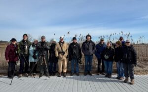 At 9:30 a.m. 14 of us met up at A.W. Stanley Park, and after brief introductions and Robert Rickman generously volunteering to keep track of and submit the e-bird list for our trip (thank you, Robert!), we heard “chuff” calls from the trees at the back of the parking lot. Oho, a Red-bellied Woodpecker was moving around on bare upper branches of a tree. It stayed there long enough for us to practice our bird-location-describing skills, to do some comparisons of binoculars, and to have us looking in the right direction when a Pileated Woodpecker flew by, white wing spots flashing.
