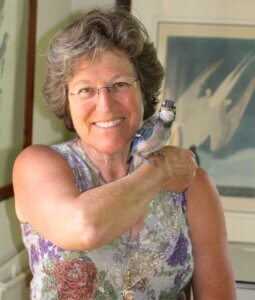 Julie Zickefoose lives and works on an 80-acre wildlife sanctuary in Whipple, Ohio. Her illustrated work, The Bluebird Effect, was an Oprah’s Book Club pick in 2012.  Julie recently became Advising Editor to the updated Bird Watcher’s Digest Magazine. Her newest book is Saving Jemima: Life and Love With a Hard-Luck Jay, the intimate story of how an orphaned bird can save a soul. (See Julie and Jemima below)